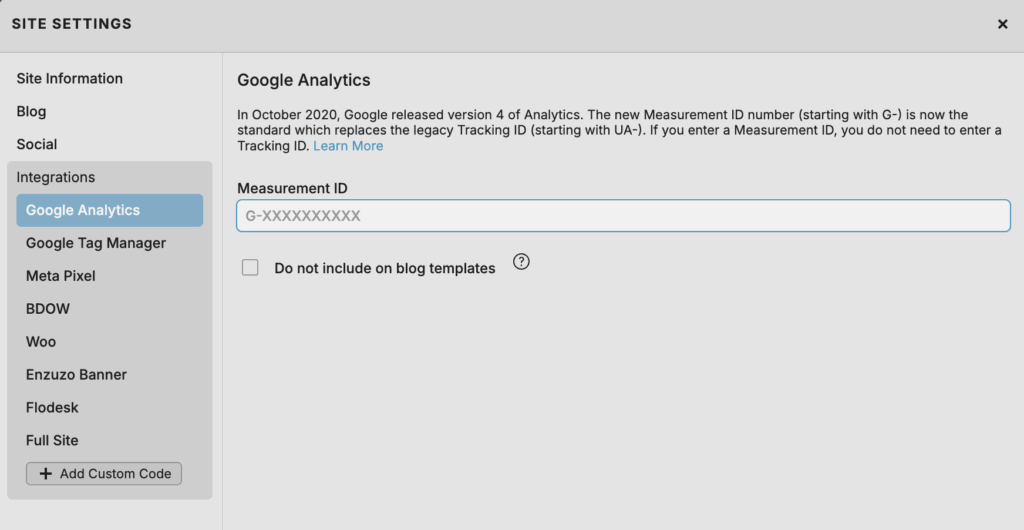 Under Integrations section, you’ll see a Google Analytics area to paste the Measurement ID in the Google Analytics field.