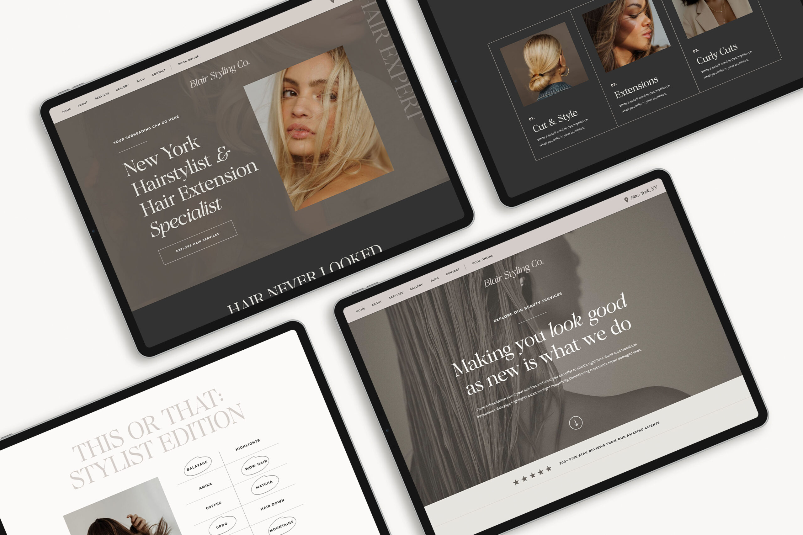 This bold, editorial Showit website template commands attention. Blair’s modern, luxurious design is perfect for hairstylists, hair salons, beauty salons, and service providers who want to attract clients ready to invest in luxury experiences. The sophisticated layout effortlessly showcases your expertise while guiding visitors toward booking their transformation. Blair will help turn your website into a powerful tool that books your chair with dream clients.