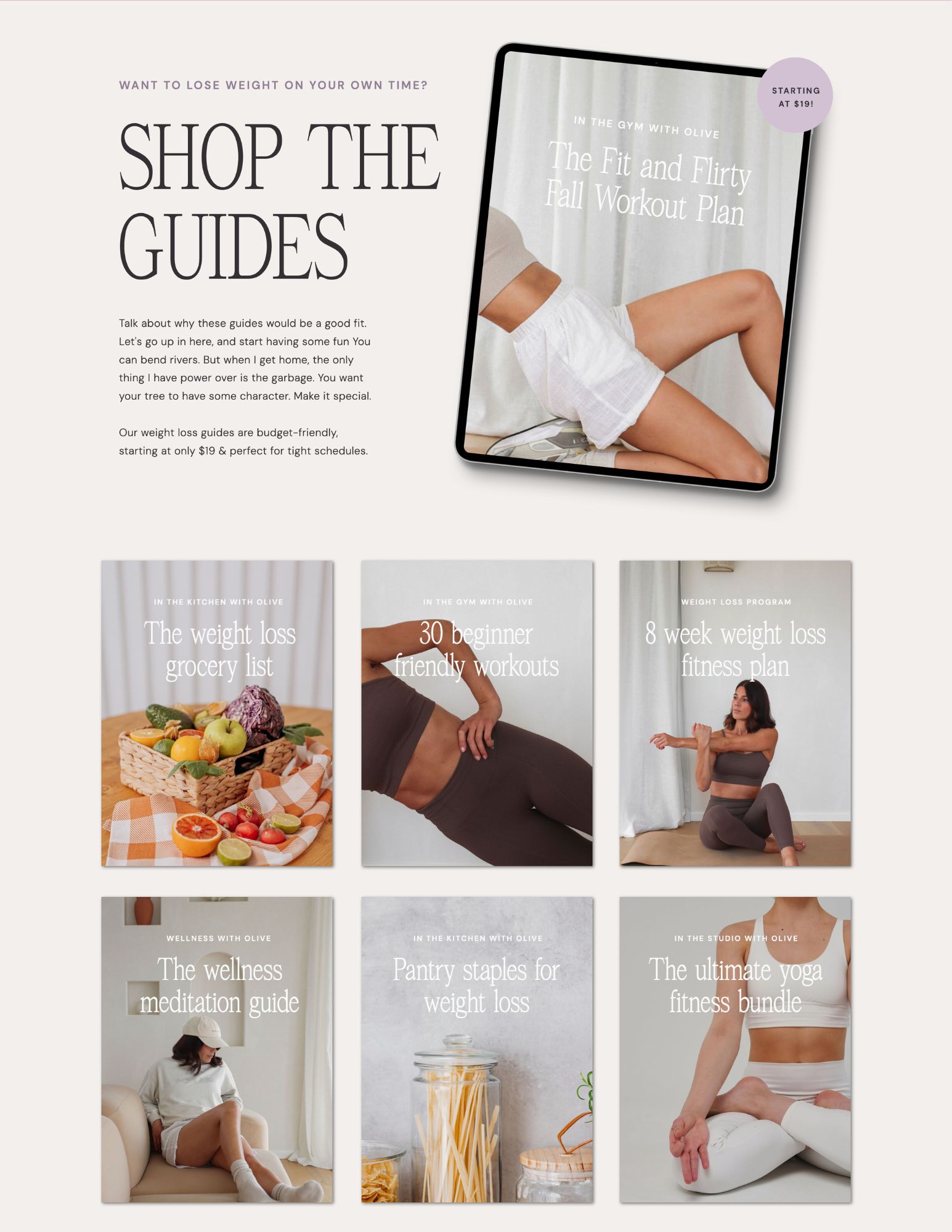 The Olive Shop Page Template is a fresh, vibrant add-on page designed for selling digital downloads or physical products on your Showit website. This template includes both a main shop page and single product page layout, perfect for coaches, service providers, and entrepreneurs ready to add e-commerce to their site.
