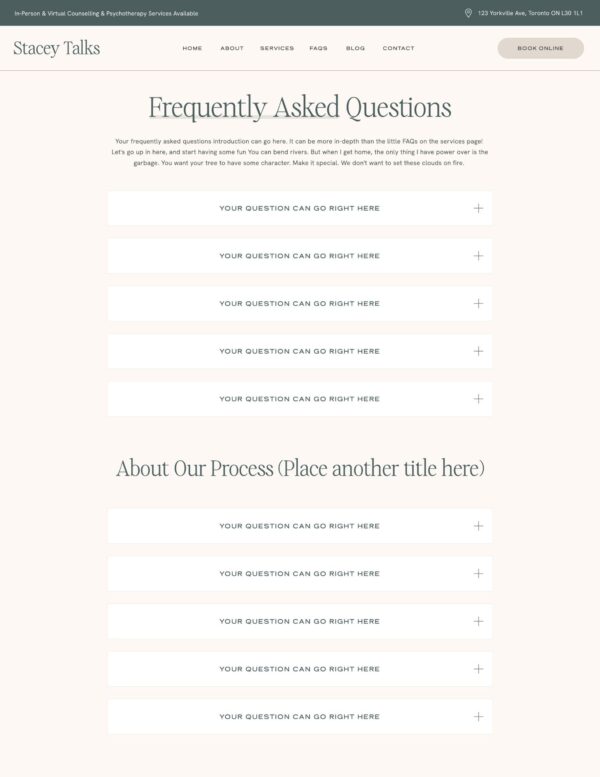 The Stacey FAQs Page Template is a clean, professional add-on designed to keep your Showit website informative and easy to navigate. This flexible template works as a standalone Frequently Asked Questions page or can be added as a section to any existing page, perfect for therapists, service providers, and professionals who want to answer client questions upfront. Includes a PDF guide with setup instructions.