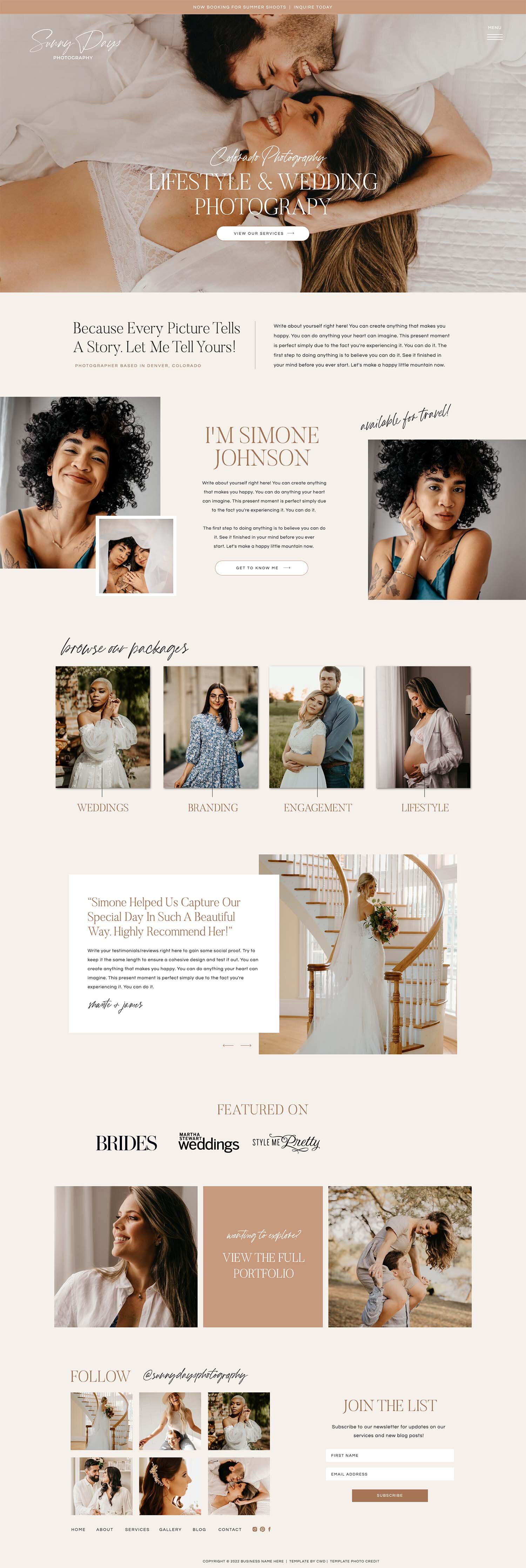 Sunny is a warm, fun Showit template designed for photographers and wedding professionals. This boho design balances beautiful imagery with space for testimonials and service details, making it a bestseller across multiple industries.